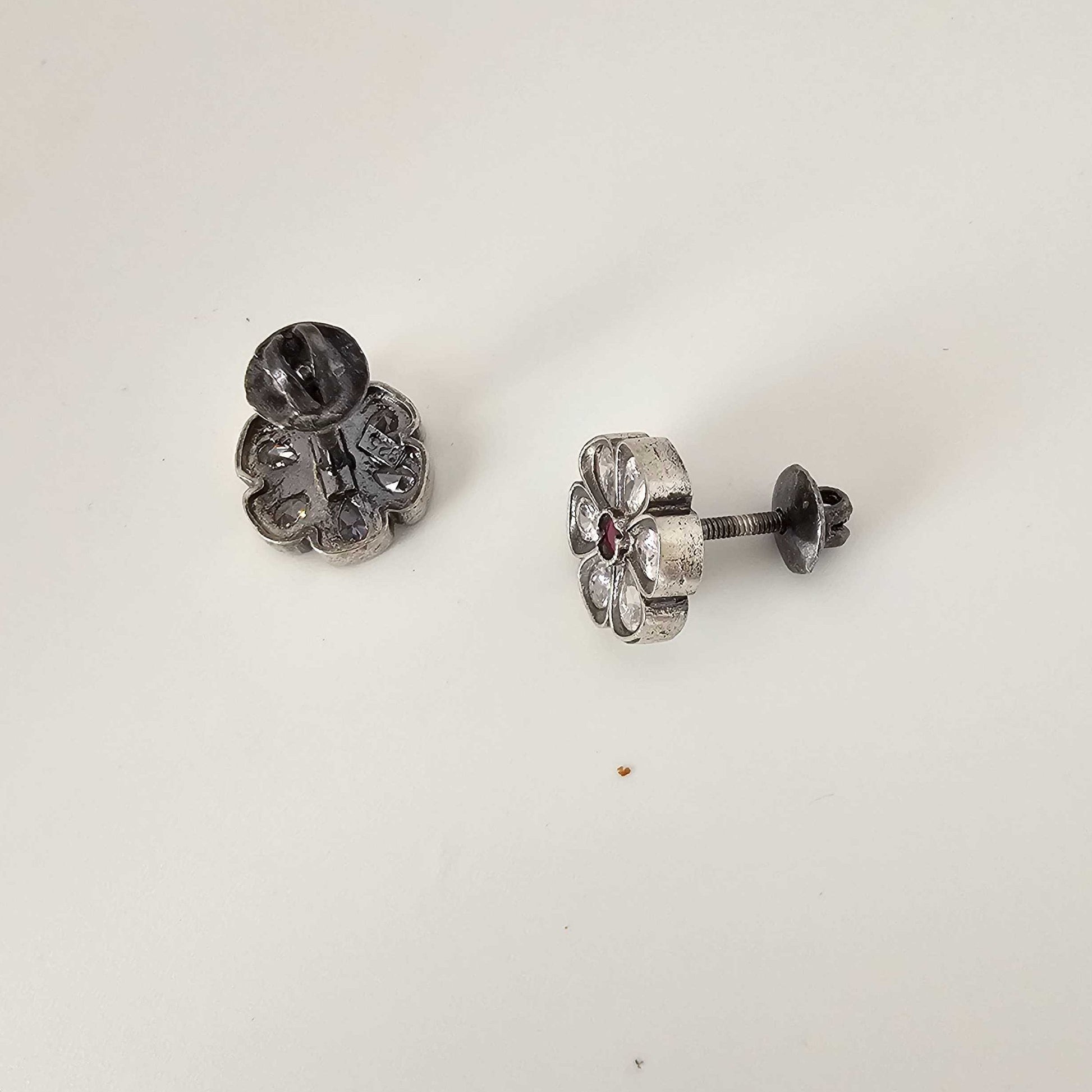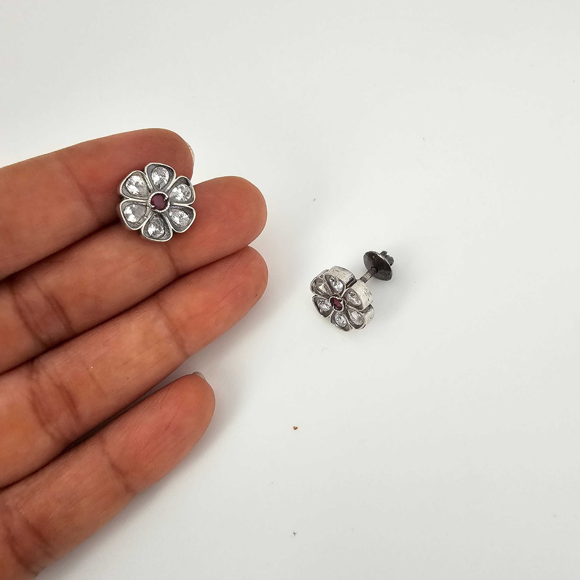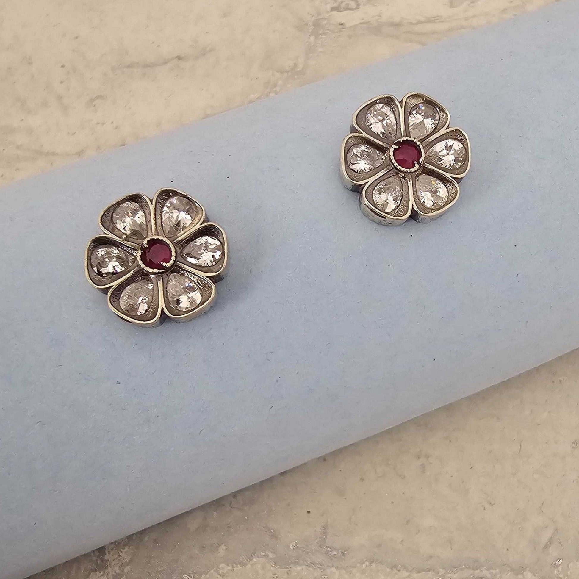 Silver Cutstone Ruby Center 6 Petal Stud