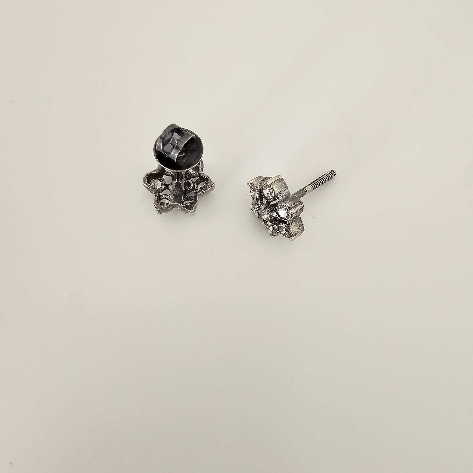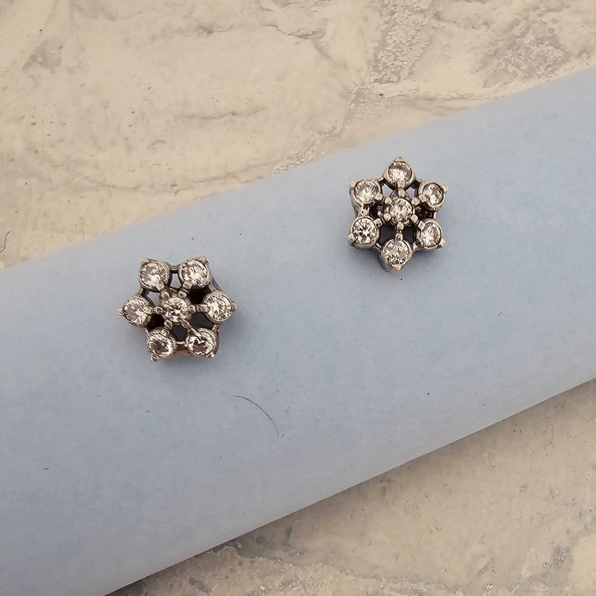 Description: Inspired by floral motifs, these Silver Kundan Cutstone Stud Earrings are adorned with cutstones arranged in a delicate flower pattern.