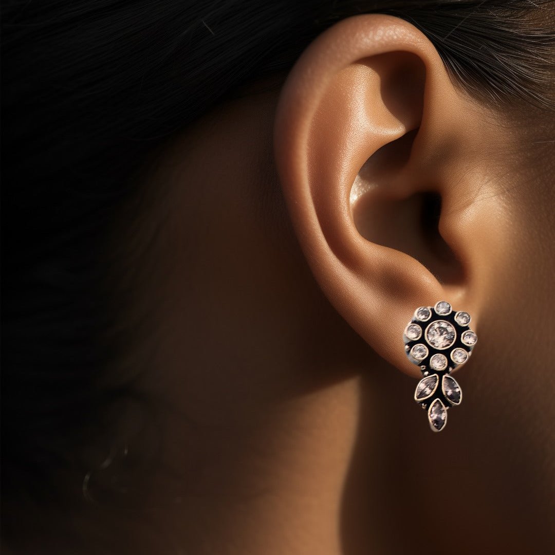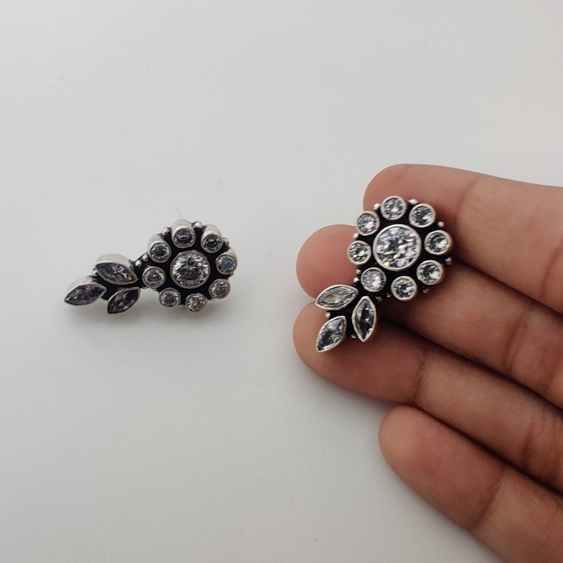 Description: Inspired by floral motifs, these Silver Kundan Cutstone Stud Earrings are adorned with cutstones arranged in a delicate leaf pattern.