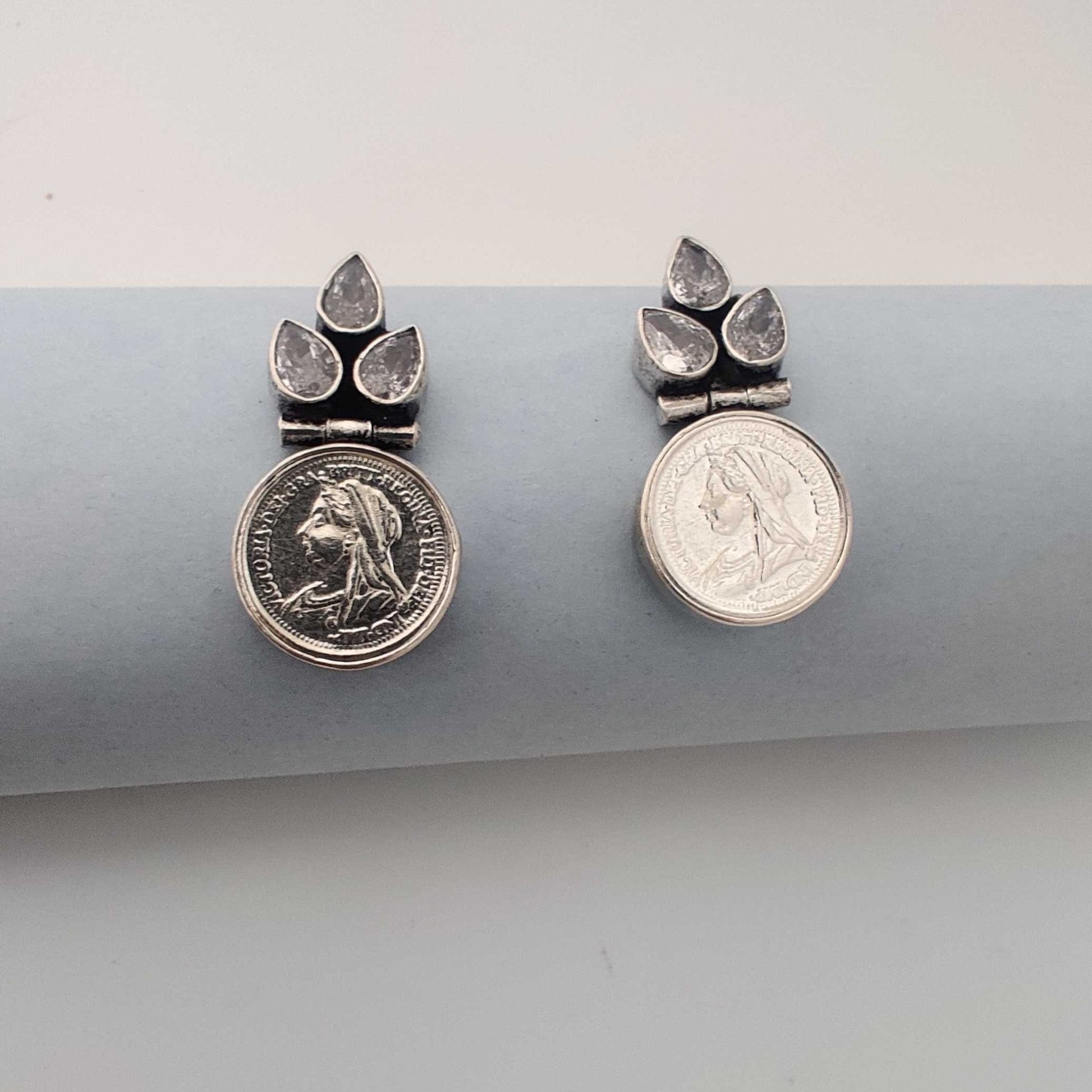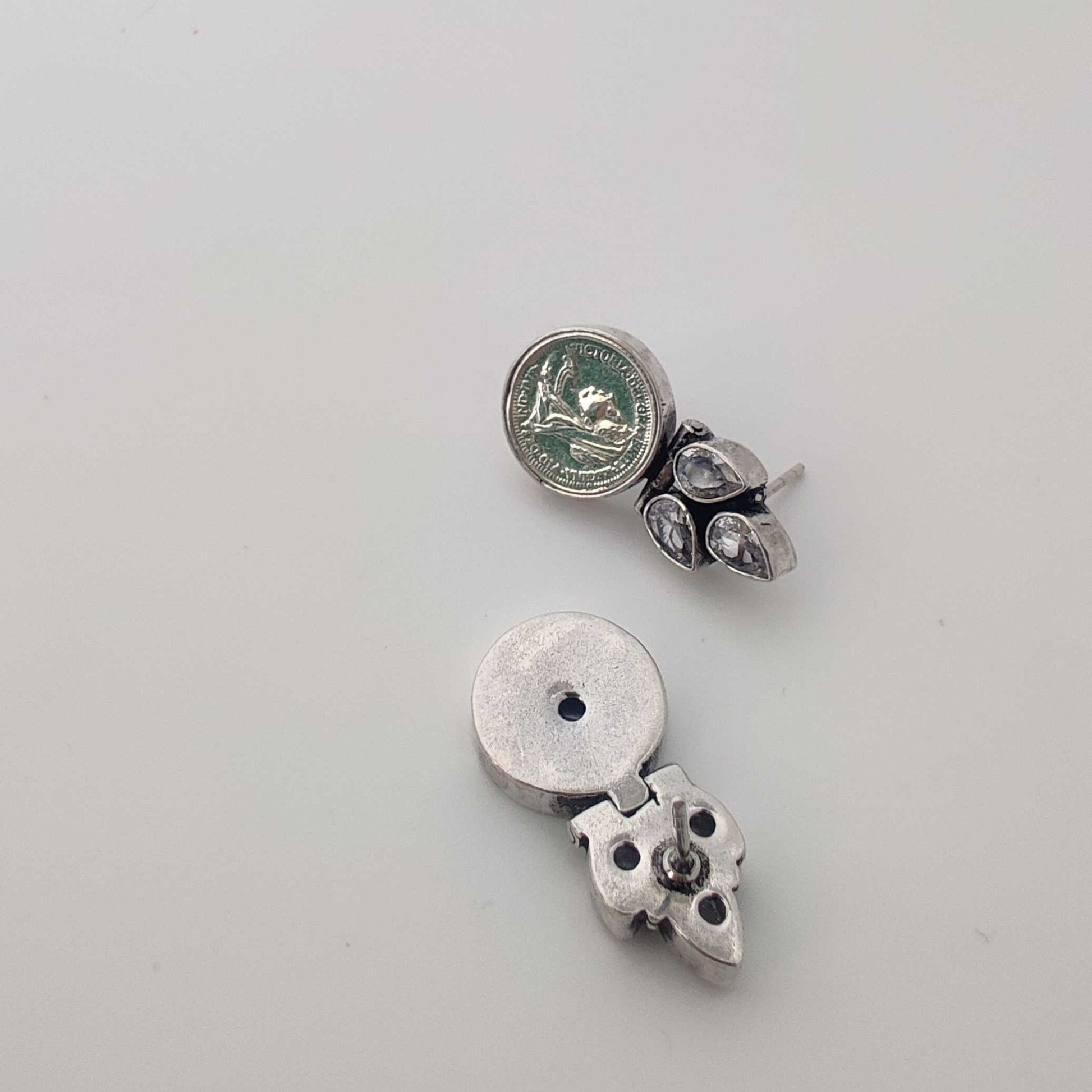 Description: These Silver Coin Cutstone Stud Earrings are adorned with cutstones arranged in a delicate leaf pattern.