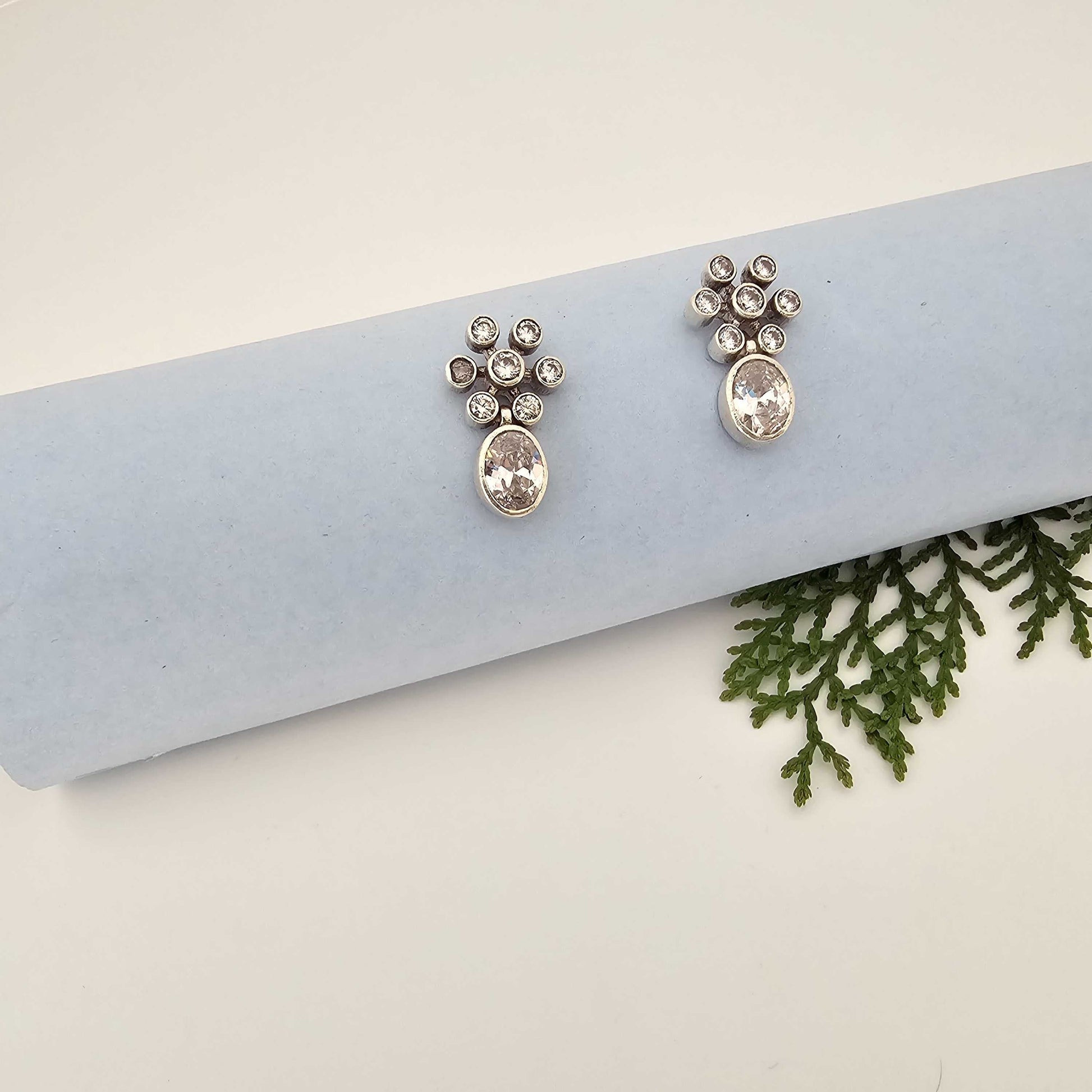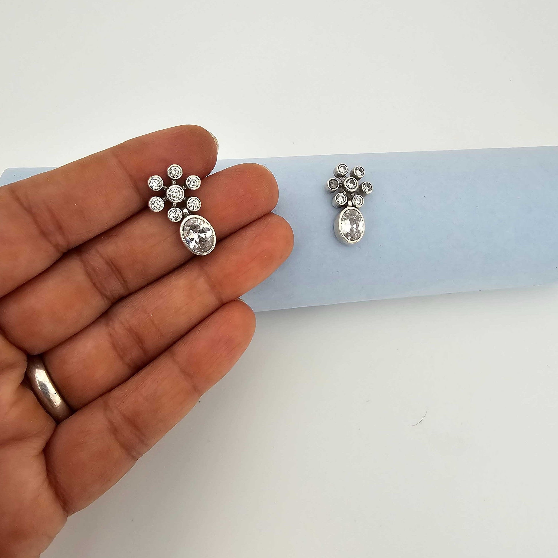 Description: Inspired by floral motifs, these Silver Kundan Cutstone Stud Earrings are adorned with cutstones arranged in a delicate flower pattern.