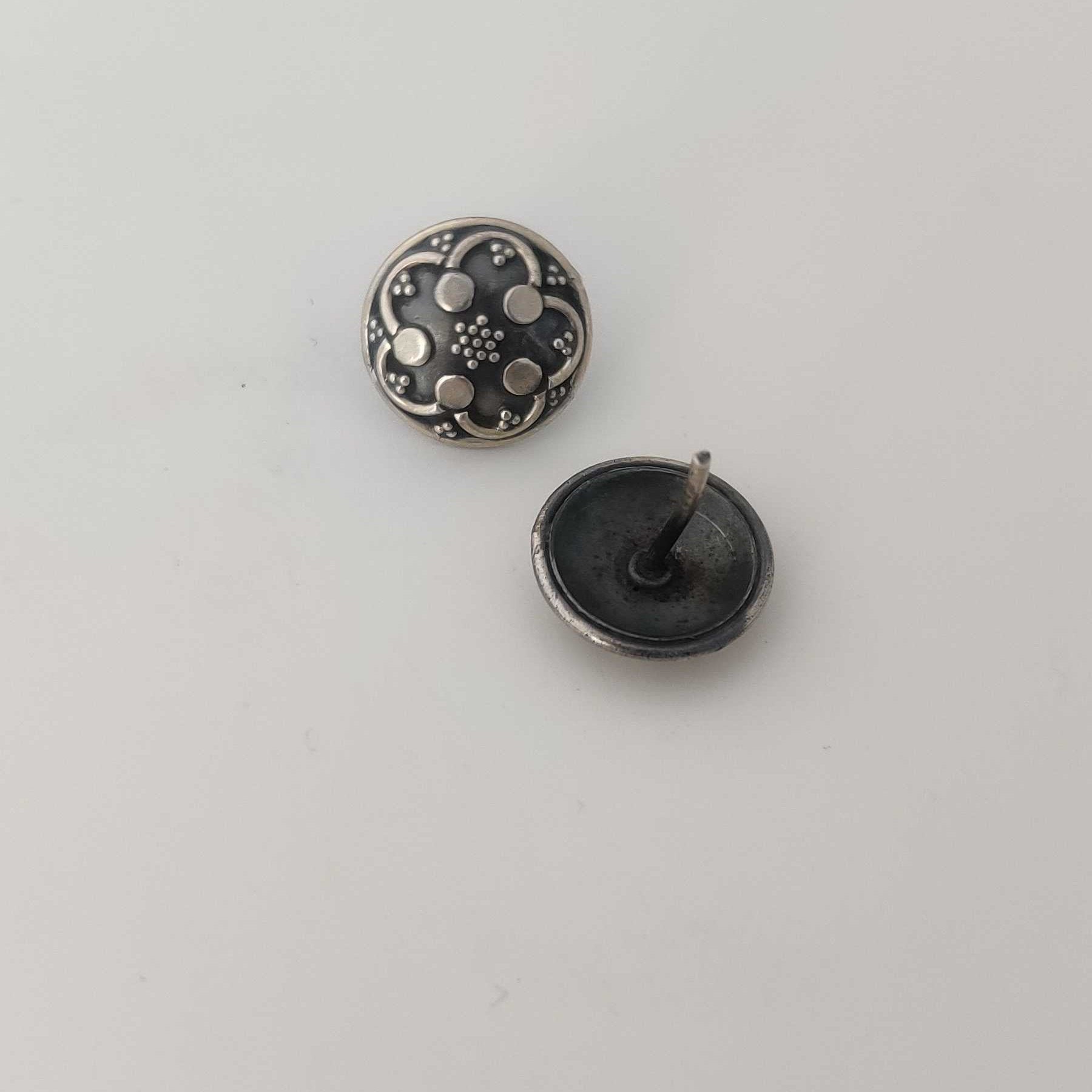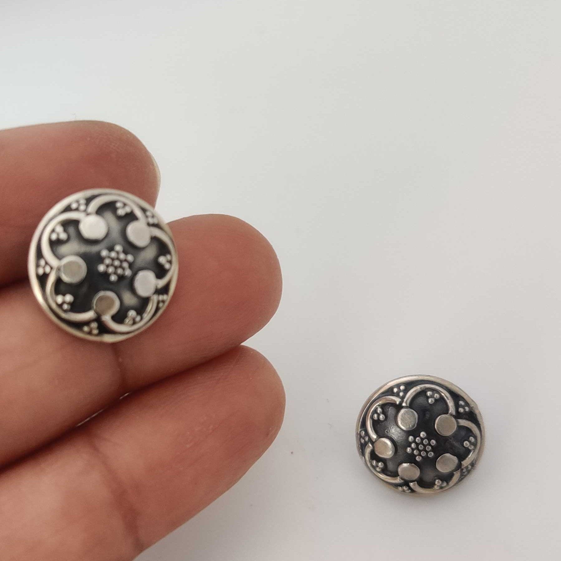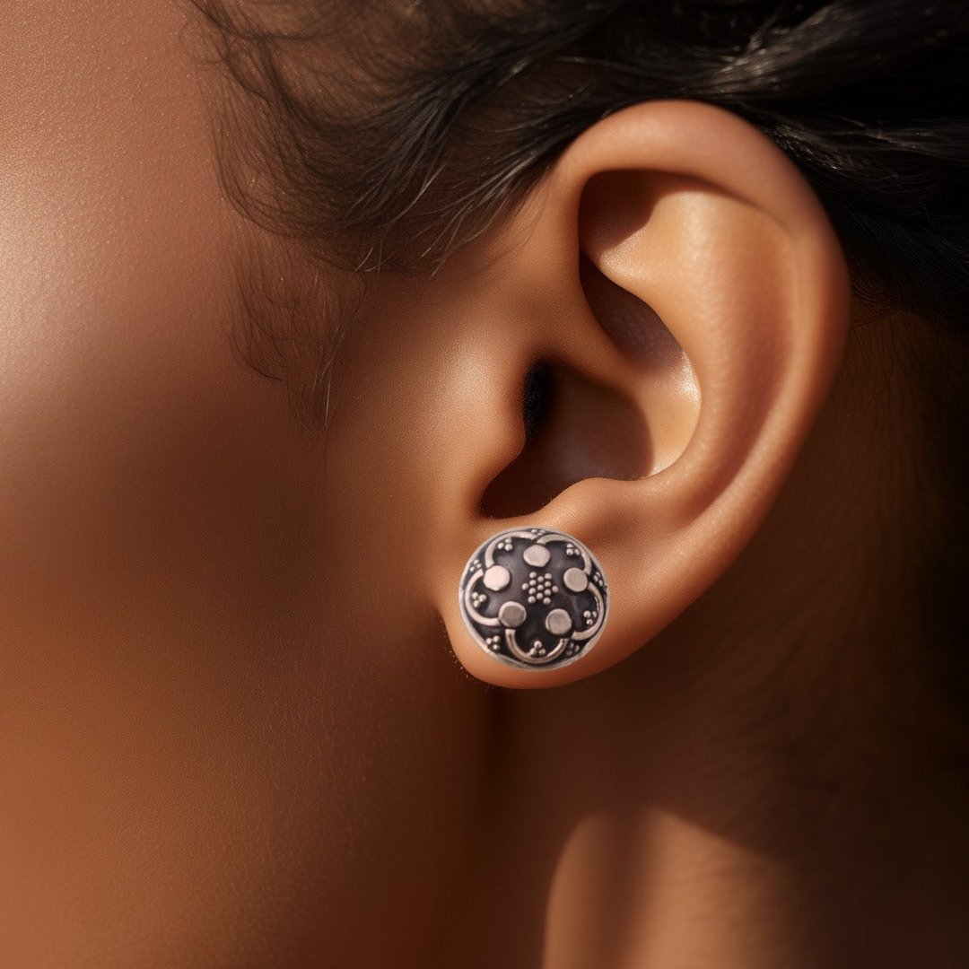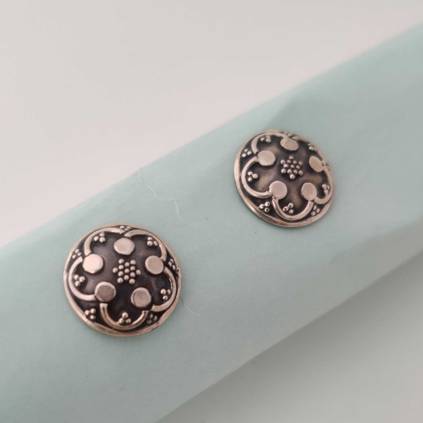 Description: These silver oxidized studs showcase intricate patterns that exude a vintage charm. The oxidized finish adds depth to the detailed design, highlighting every curve and contour with a rustic yet refined touch.