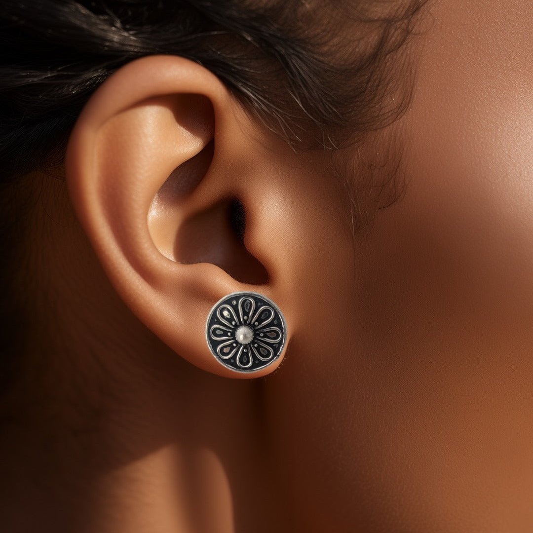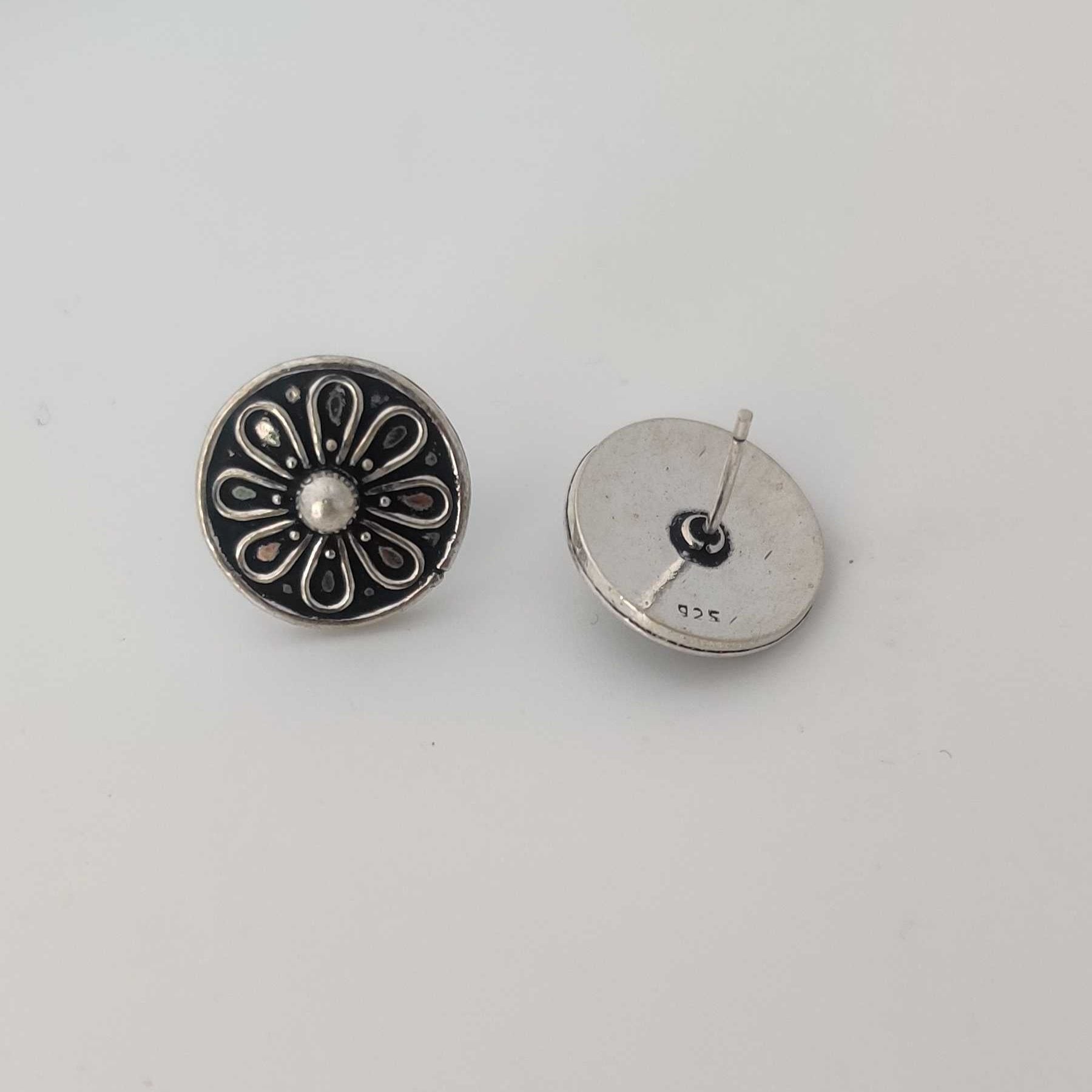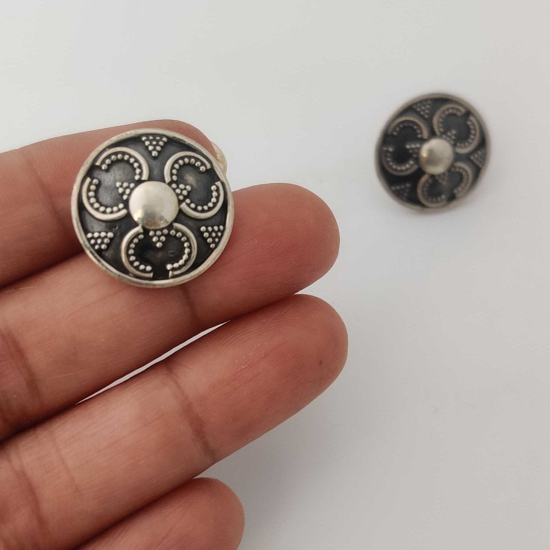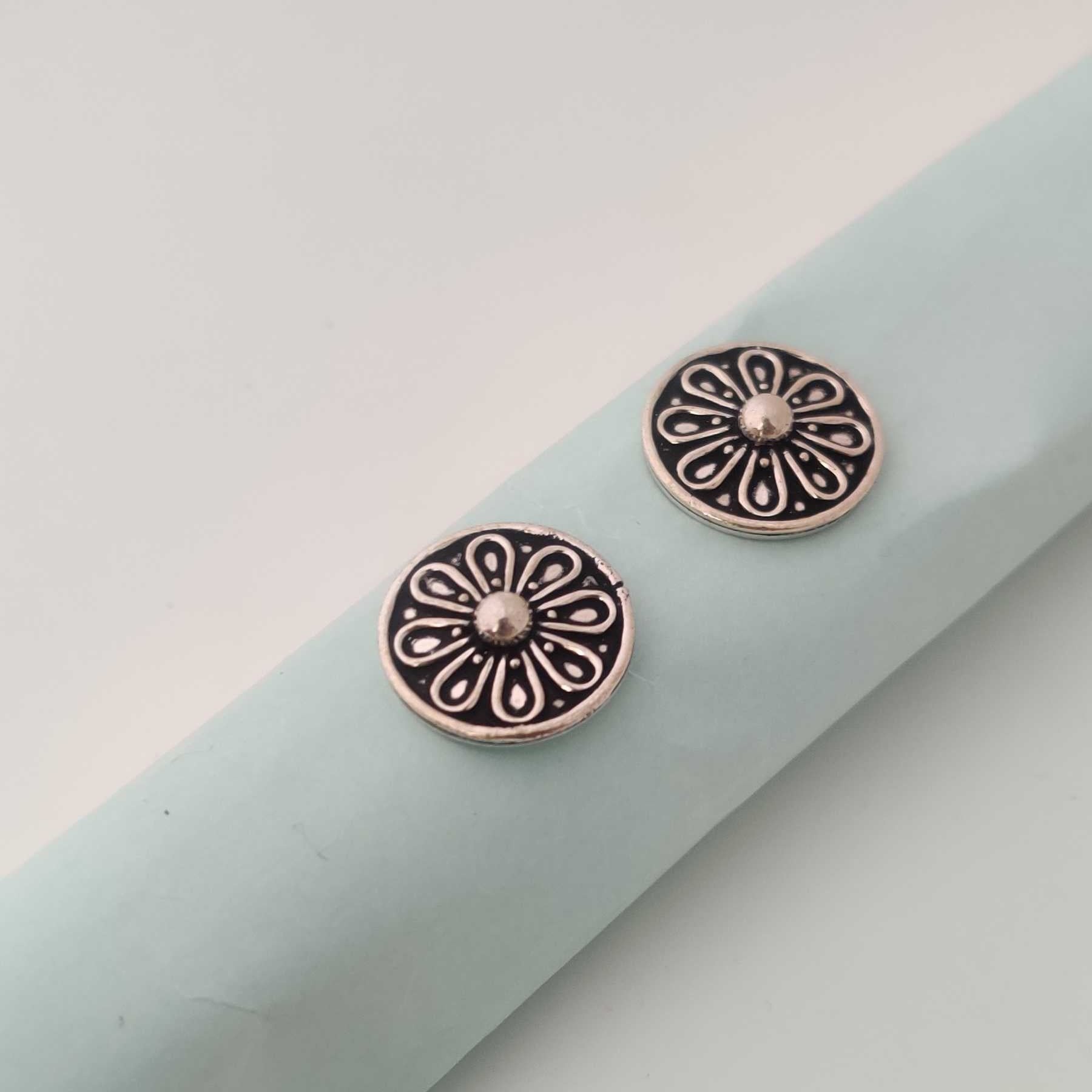Description: These silver oxidized studs showcase intricate patterns with a gem center that exude a vintage charm. The oxidized finish adds depth to the detailed design, highlighting every curve and contour with a rustic yet refined touch.