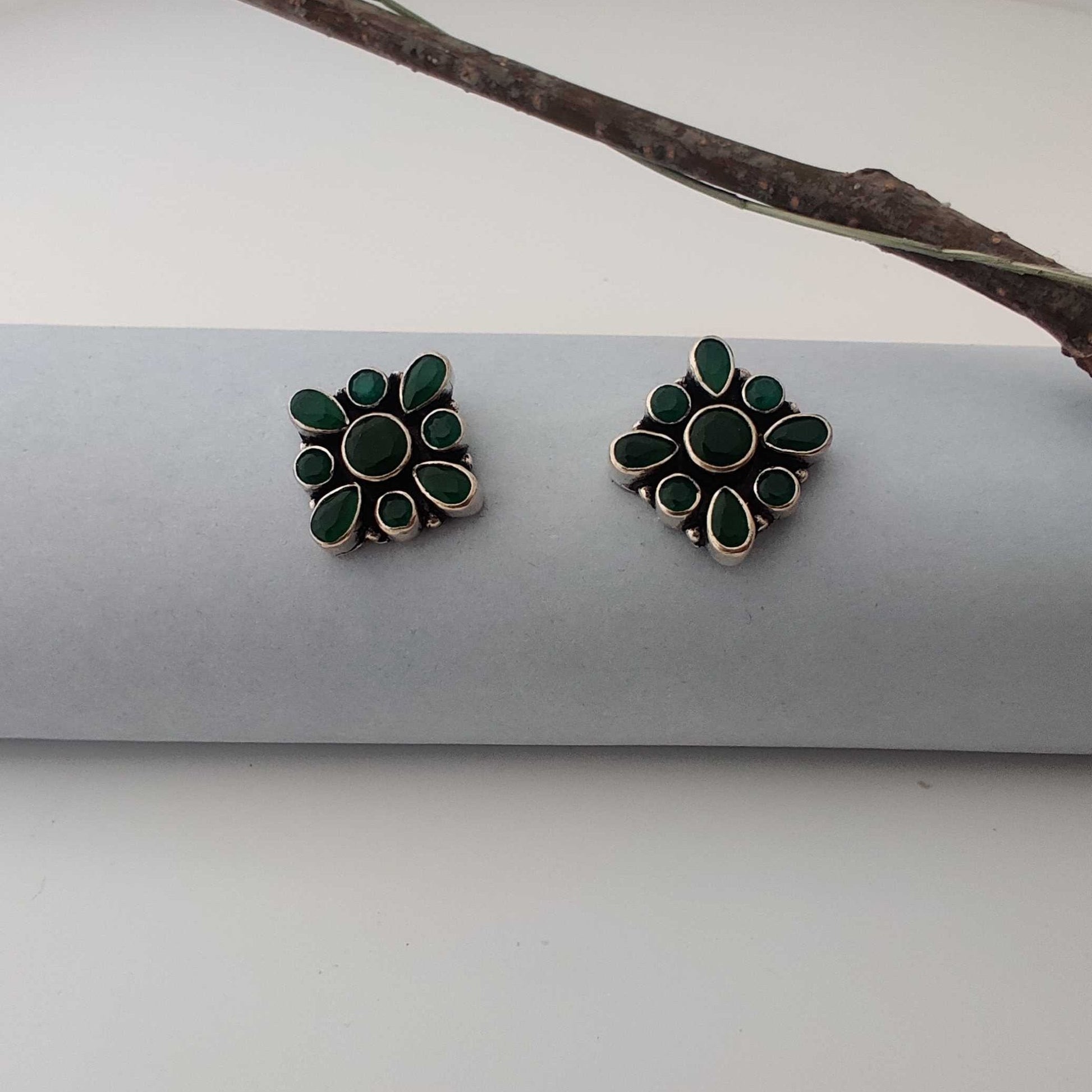 Description: These elegant square studs feature a beautiful floral design with a dazzling cut stone. The polished edges of the square frame highlight the detailed artistry, making these studs a stunning statement piece.