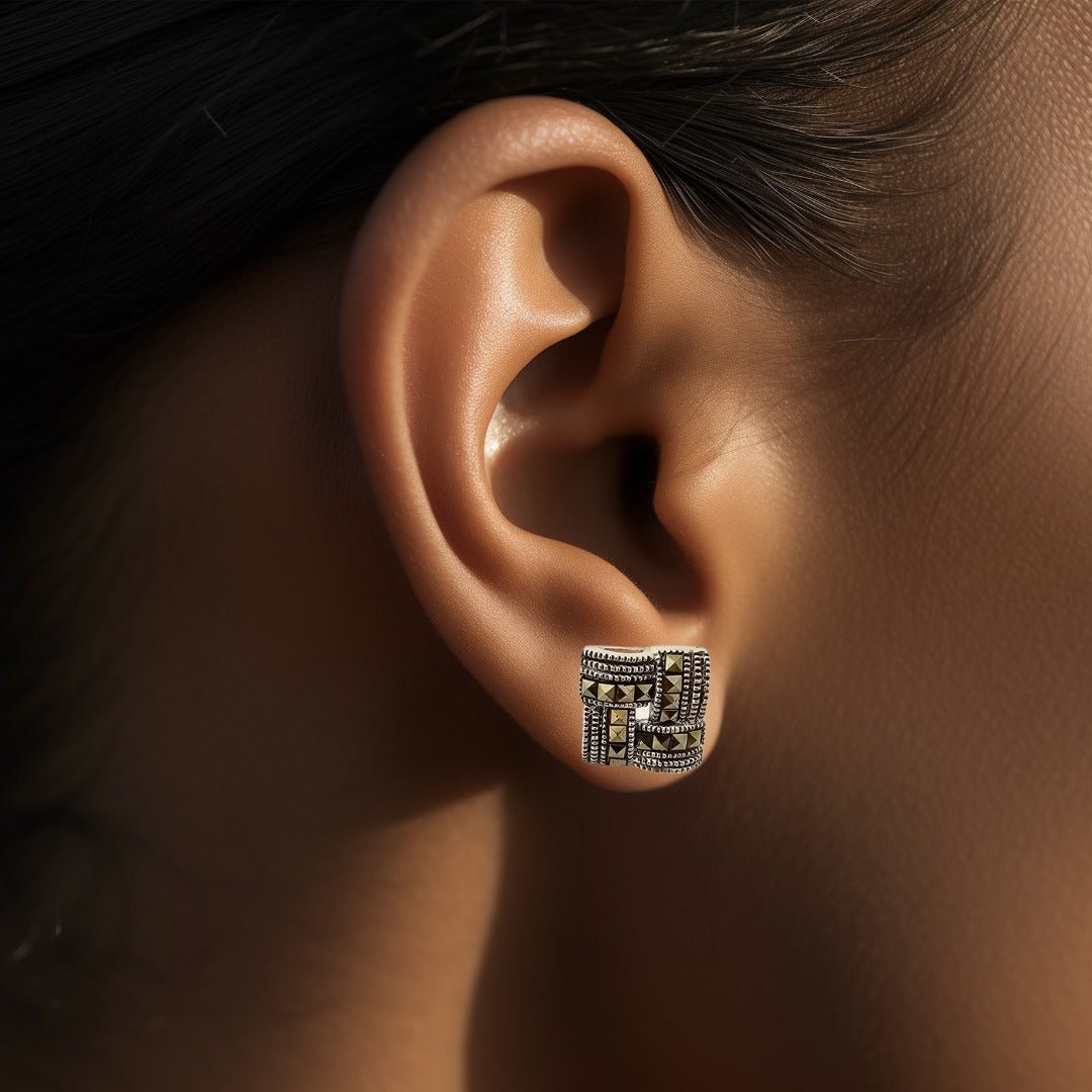 Description: These Contemporary International Swissmarka Design Stud Earrings feature a sleek and modern pattern inspired by traditional motifs.